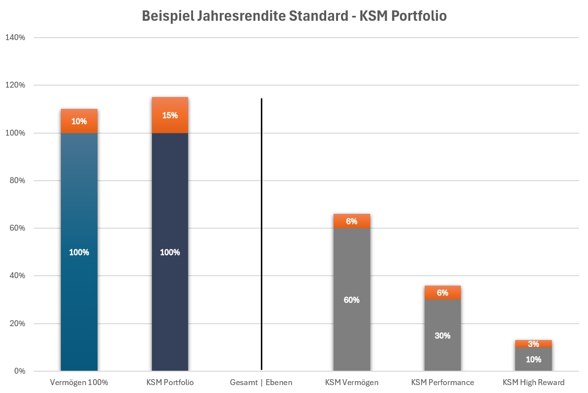 Die Diagramme zeigen eine idealisierte beispielhafte Vergleichsdarstellung unseres 100% Vermögensdepots im Vergleich zum KSM Portfoliomodell, das risikoreichere Strategien beinhaltet. Sie dienen lediglich zur Veranschaulichung der Idee des KSM Portfoliomodells. Tatsächliche Entwicklungen unterliegen immer den typischen Marktschwankungen und können phasenweise deutlich von langfristigen Durchschnittswerten abweichen.