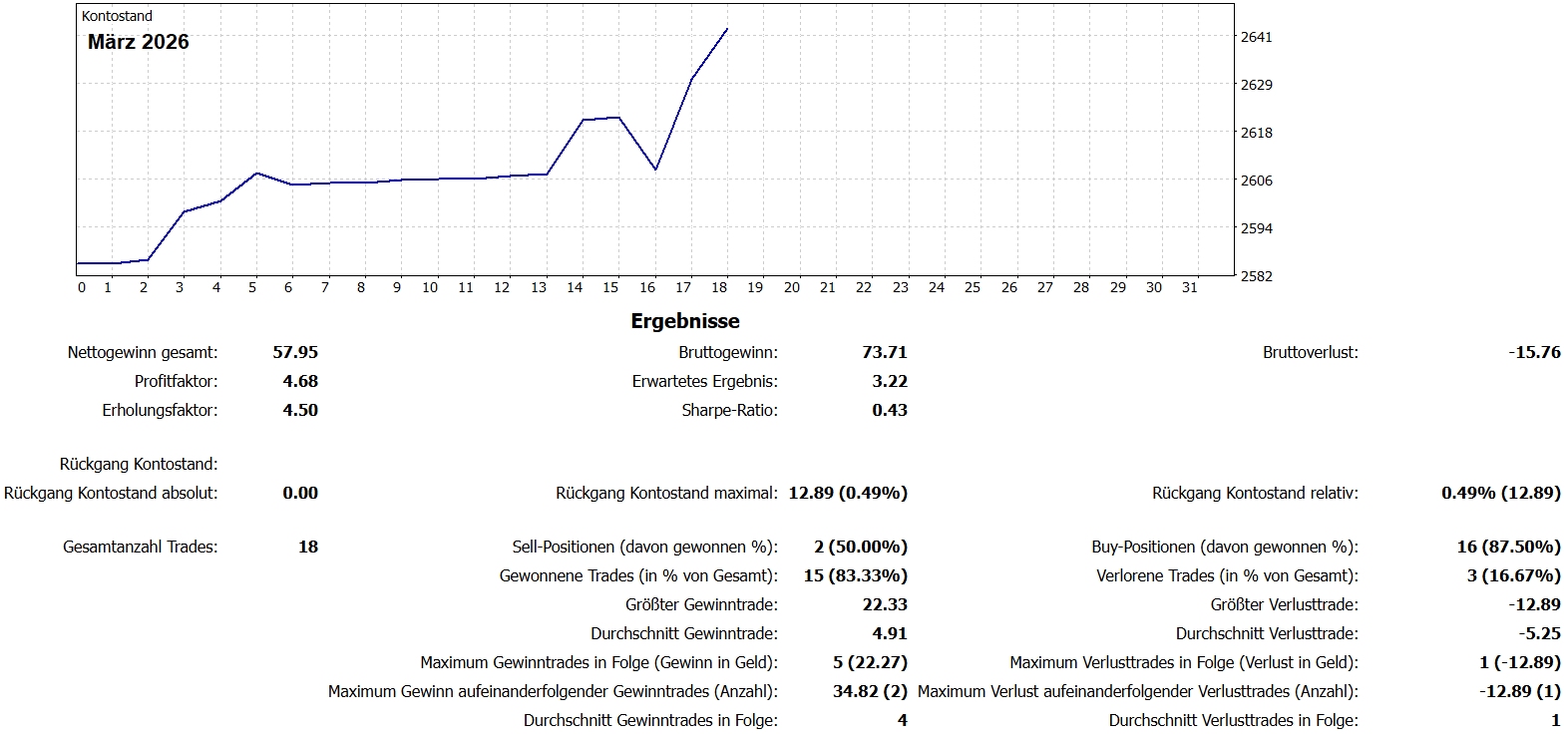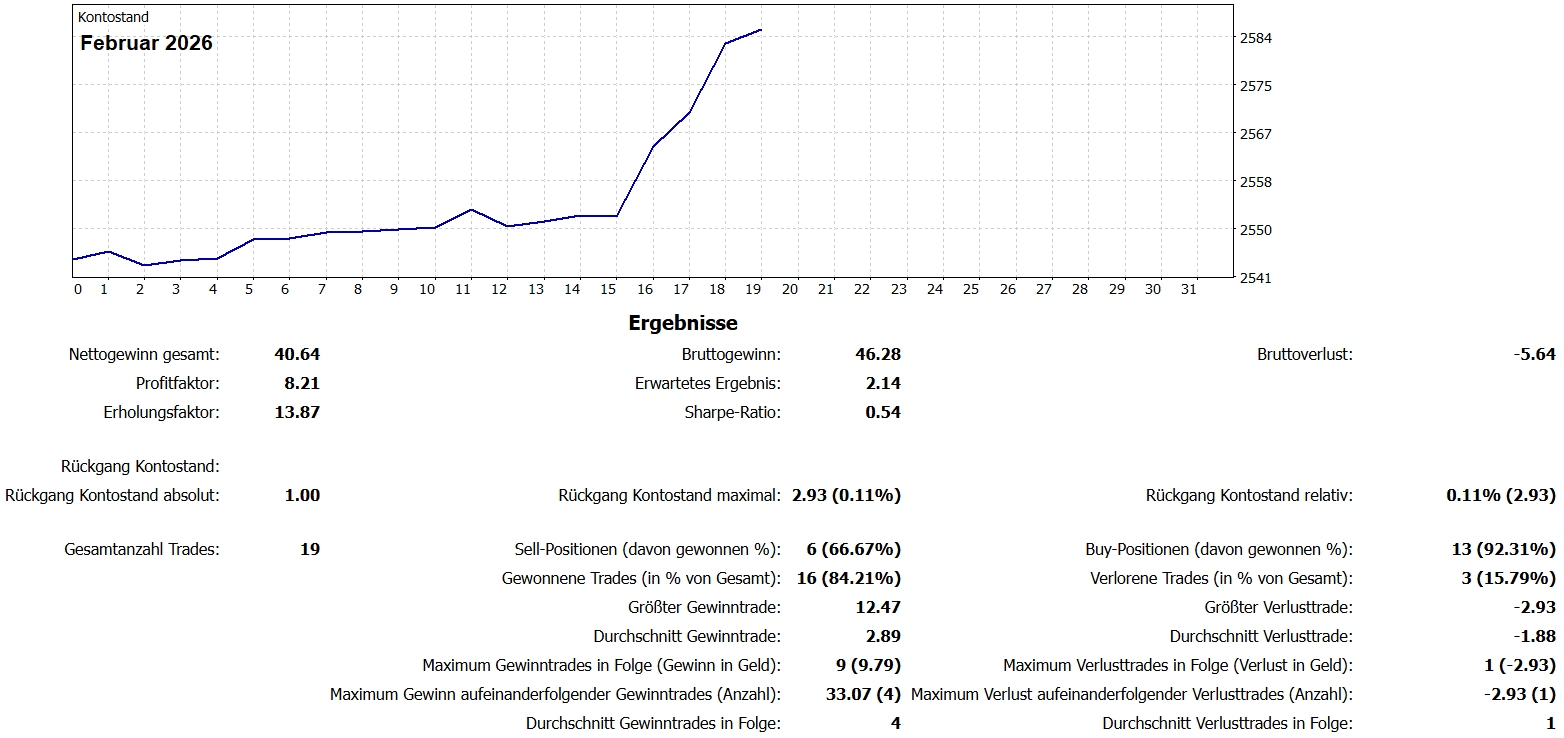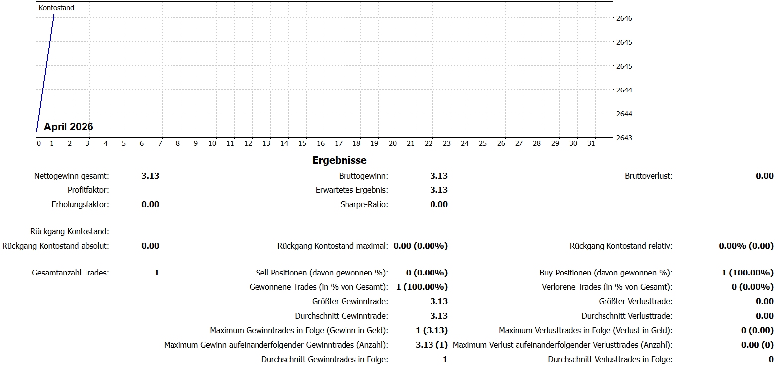 Die hier ausgewiesenen Gewinne sind in Punkte angegeben. So ist es möglich eine eigenständige Überprüfung im Hinblick auf die Profitabilität der Strategie auf Basis eigener Parameter anzustellen. Im Referenzkonto wird der DAX aktiv gehandelt. Da sich die Wertigkeit des DAX stetig verändert, muss das erforderliche Kapital zur Umsetzung der Strategie stets auf Basis des jeweils aktuellen Indexhöchststands selbst berechnet werden. Ein guter Richtwert für das erforderliche Kapital für die Positionsgröße von 1,0 Lot berechnet sich aus dem jeweiligen Index-Höchststand in Euro. Beispiel: DAX 23000 Punkte = 23.000€ Kapital für 1,0 Lot Positionsgröße. Diese Berechnung dient nur als grober Richtwert und kann je nach persönlicher Risikoneigung anders sein. Anhand der absoluten Gewinne und des Drawdowns (Kontotracking siehe oben oder MetaTrader 5 Kontoauszüge siehe unten) lässt sich die Rendite der Strategie und der Drawdown mit jedem Kapitaleinsatz selbst berechnen. Beispiel: Ein absoluter Gewinn von 1.500€ und ein Kapitaleinsatz von 5.000€ ergibt eine Brutto-Rendite von 30%. Die Attraktivität der Handelsergebnisse obliegt der eigenen Bewertung.